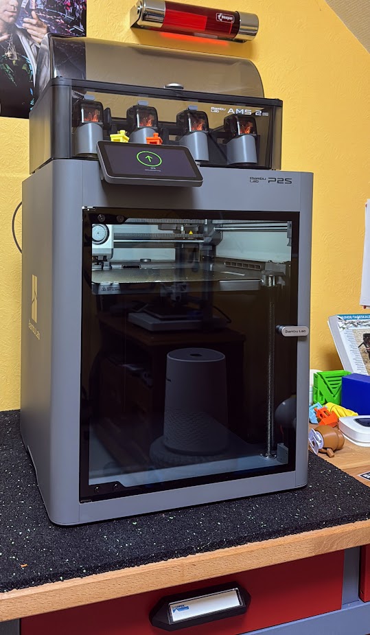 Der Bambu Lab P2S ist das neueste Mitglied meiner 3D-Druckerflotte. Er erweitert meine Produktionskapazität spürbar und übernimmt sowohl einfarbige als auch mehrfarbige Aufträge zuverlässig und in hoher Qualität. Damit ergänzt er perfekt die bestehende Flotte aus H2D, X1C und A1.